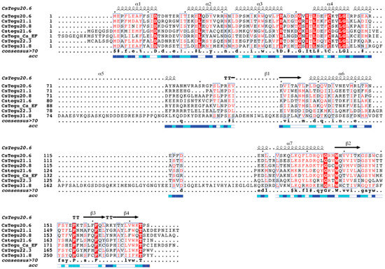 In a typical EF-hand, six residues are necessary for the coordination of the calcium ion. These are labeled as the X, Y, Z, −Y, −X and −Z residues, and consensus residues at these positions have been identified [46]. Residues Asp46, Asp48, Ser50, Val52, Thr54 and Glu57 were predicted as constituting a potential calcium-binding site in the EF-hand of CsTegu20.6 using COACH [47] (Figure 6). The consensus is mostly observed, with a different residue, Val52, at the −Y residue, which is rarely observed at this position. The orientation of the Val52 side chain is also more distant from the calcium-binding site compared to that of the Thr52 side chain in a typical EF-hand. Therefore, it is improbable that this EF-hand contacts calcium ions.