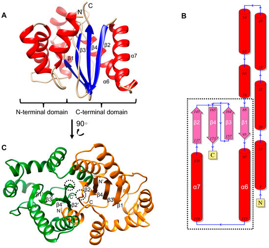 Structural characterization and homodimer. (A) The α-helices, β-strands and coils of the CsTegu20.6 are colored in red, blue and gold, respectively. N- and C-terminal domains are connected by a flexible linker, which is an intrinsically disordered region. The C-terminal domain constitutes a sandwich of a four-stranded antiparallel β-sheet, β1-β3-β4-β2, and two α-helices, α6 and α7; (B) Secondary structure topology diagram showing domain composition and connectivity. The ribbon diagram indicates α-helices and β-strands in red and magenta color, respectively. The diagrams associated with the ferredoxin fold are indicated with a dotted rectangle; (C) The homodimer with symmetry-related CsTegu20.6 monomers (green and orange) was constructed by GalaxyGemini [44]. The missed fifth β-strand is indicated with dotted circles [45] (see Section 2.6).