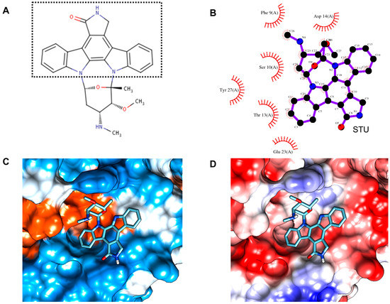 Structural and detailed view of interaction of compound with CsTegu20.6. (A) STU (staurosporine). The fused indole and carbazole ring is indicated with a dotted rectangle; (B) The binding mode of STU in the CsTegu20.6 binding pocket obtained from GalaxySite [48]. Putative inhibitor and residues that are in close contact with each other are indicated in 2D diagrams. The residues, marked with red spoked arcs, involved in hydrophobic interactions with the compound; (C) Hydrophobic surface. The binding pocket is colored from blue for the hydrophilic region to orange for the hydrophobic region; (D) Electronic surface. The binding pocket is indicated from blue for the negatively-charged region to red for the positively-charged region.
