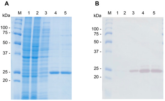 Expression and purification of rCsTegu20.6. The rCsTegu20.6 was detected in E. coli BL21(DE3) pLysS through SDS-PAGE staining by Coomassie brilliant blue (A) and Western blot with anti-polyhistidine antibody (B). Molecular weight marker (M), lysate of E. coli with pRSETb-CsTegu20.6 before induction (Lane 1) and after induction (Lane 2), flow through (Lane 3), purified recombinant proteins (Lanes 4 and 5).