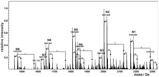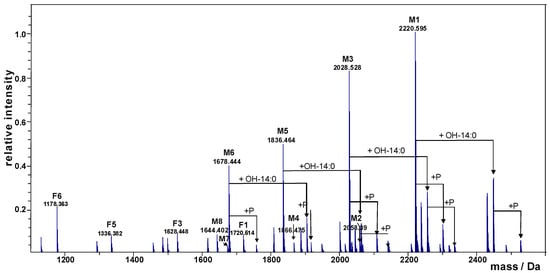 In particular, the following composition was attributed to the M1 species: GlcN2P2Kdo2Hep5Glc1ΔGalA, where ΔGalA represents an unsaturated galacturonic acid. The presence of this acid unit in the M1 species clearly indicated that the strong alkaline conditions determined the lack of one or more sugars from GalA, due to a β-elimination reaction [17]. Species M3, M5, and M8 differed from M1 in their heptoses composition, displaying four units in M3 and three and two in M5 and M8, respectively. The remaining species, M2, M4, and M7, lacked a glucose unit respect to M1, M3, and M5, respectively, thus confirming the terminal position for this residue, while the M6 species lacked ΔGalA compared to M5. Further mass peaks originate from an additional phosphate group P (Δm = +79.966 u) and/or one linked C14:0(3OH) fatty acid (Δm = +226.193 u) due to incomplete deacylation. Finally, F1–F6 are fragments induced during the ESI process leading to the cleavage of the lipid A backbone GlcN2P2 (Δm = −500.081 u).