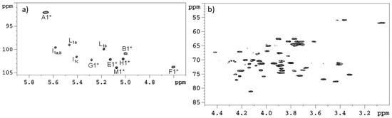 Anomeric (a) and carbinolic (b) region of 1H-13C HSQC-DEPT of the totally deacylated LPS (L-OSKOH) from E. amylowora waaL mutant. All the correlation cross-peaks in the anomeric region indicate the signals of structures 1a–c. The spectrum was recorded in D2O at 298 K at 600 MHz.