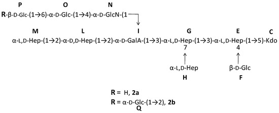 In addition, the O-substitution at position 2 of I was inferred by the long-range between H1 of L and C2 of I. The value of the coupling constant 3JH1,H2 of the anomeric proton was found to be 3.5 Hz, thus indicating for residue I an α configuration. The chemical shifts of heptoses E, G, H, L, and M were in agreement with that already found for structure 1, as well as that of terminal β-Glc F. Finally, both the HMBC (Figure S2) and ROESY experiments indicated the sequence shown in structure 3, which is in agreement with strain genomics.