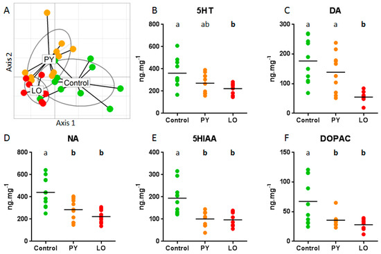 Analysis of monoamine brain content. (A) principal component analysis (PCA) global analysis of brain monoamine concentrations clearly identify pyrolytic (PY) and light crude oil (LO) as different from Control group. PCA axis 1 contributed to 82.1% of variability and PCA axis 2 for an additional 8.8%; (B–F) Detailed analysis of brain monoamines and metabolites concentrations in PY, LO and Control fish. Each dot represents results from an individual fish. Letters indicate significant differences at p < 0.05 between diets.