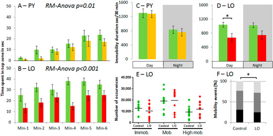 Analysis of behavioural traits. (A,B) Mean time spent in top zone as evaluation of anxiety using novel-tank paradigm; (C,D) Immobility duration during day and night in a 24 h-swimming test; (E) Number of events in each mobility class for individual fish and mean; and (F) Relative proportion of Immobility (black), mobility (dark grey) and high mobility (light grey) events during day period in a 24 h-swimming test. n = 12 individuals; values are mean ± standard error of the mean; except in E (individual values and means) and F (means). In A and B since RM-Anova takes all time points into account the p-value is indicated in the figure, otherwise * indicates significant difference at p < 0.05 for PAHs diets compared to the Control.