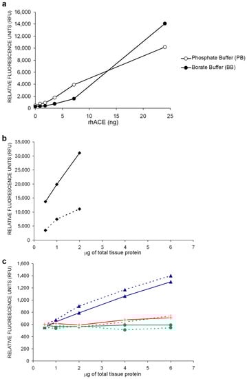 2.1. Establishing Buffer Assay and Optimal Amounts of Protein for ACE and ACE2 Activities Measurement in Several Tissues