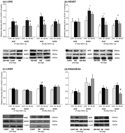 2.5. ACE and ACE2 Protein Expression in Heart, Lung, Liver, and Pancreas from Diabetic, Insulin-Treated, and Control mice