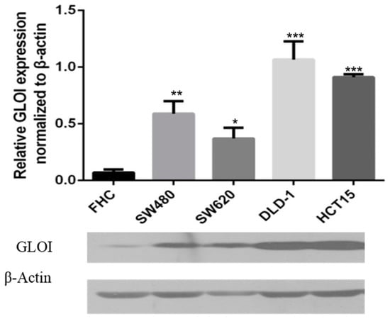 GLOI expression was significantly higher in CRC cells SW480 (p < 0.01), SW620 (p < 0.05), DLD-1 (p < 0.001), and HCT-15 (p < 0.001) than in normal FHC colon cells (Figure 1). Levels of GLOI protein in the CRC cells ranged from 50% to 100% higher than those in FHC cells.