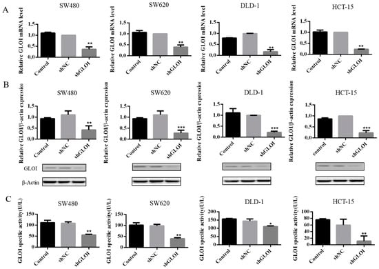 GLOI knockdown suppresses expression of GLOI mRNA, protein, and enzyme activity in colorectal cancer (CRC) cells. The expression of GLOI mRNA (A), GLOI protein (B), and GLOI enzyme activity (C) was lower in SW480, SW620, DLD-1, and HCT-15 CRC cells transfected with short hairpin GLOI (shGLOI) than in cells transfected with short hairpin empty vector (shNC). * p < 0.05, ** p < 0.01, *** p < 0.001. All data are representative of three independent experiments (n = 3).