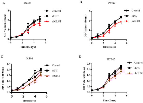GLOI knockdown inhibits colorectal cancer (CRC) cell viability. (A–D) SW480, SW620, DLD-1, and HCT-15 CRC cells were transfected with shGLOI or shNC. The growth of the cells was monitored for 5 days. Optical density (OD) * p < 0.05. All data are representative of three independent experiments (n = 3).