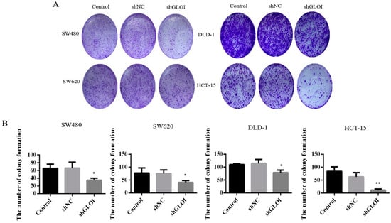 GLOI knockdown suppresses colony formation by colorectal cancer (CRC) cells. (A) SW480, SW620, DLD-1, and HCT-15 CRC cells were transfected with shGLOI or shNC (empty vector), and colony formation was monitored. (B) Numbers of colonies formed by CRC cells were quantified for comparison. * p < 0.05, ** p < 0.01. All data are representative of three independent experiments (n = 3).