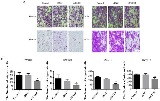 GLOI knockdown inhibits migration of colorectal cancer (CRC) cells. (A,B) SW480, SW620, DLD-1, and HCT-15 CRC cells were transfected with shGLOI or shNC (empty vector) and their migration was evaluated by their penetration of a transwell insert membrane. * p < 0.05, ** p < 0.01. All data are representative of three independent experiments (n = 3).