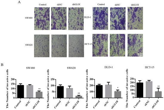 GLOI knockdown inhibits invasion by colorectal cancer (CRC) cells. (A,B) SW480, SW620, DLD-1, and HCT-15 CRC cells were transfected with shGLOI or shNC (empty vector) and their invasiveness evaluated by their penetration of a transwell insert membrane coated with matrigel. * p < 0.05, ** p < 0.01. All data are representative of three independent experiments (n = 3).
