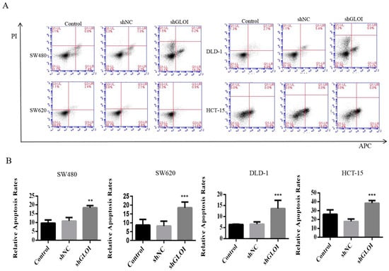 Cell apoptosis rate was increased by GLOI depletion in CRC cells. The apoptosis rates were 6.1% higher in shGLOI-transfected SW480cells than in shNC-transfected cells (p < 0.01), 6.1% higher in SW620 (p < 0.001), 5.4% higher in DLD-1 (p < 0.001), and 7.8% higher in HCT-15 (p < 0.001) (Figure 7A,B).