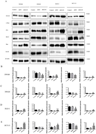 GLOI knockdown alters expression levels of STAT1 or p53 signal pathway proteins in colorectal cancer (CRC) cells. SW480, SW620, DLD-1, and HCT-15 CRC cells were transfected with shGLOI or shNC. The expression levels of signal transducer and activator of transcription 1 (STAT1), p53, c-Myc, Bcl-2, and Bax were determined in the CRC cells by (A) western blot and (B–E) quantification of results. * p < 0.05, ** p < 0.01, *** p < 0.001. All data are representative of three independent experiments (n = 3).