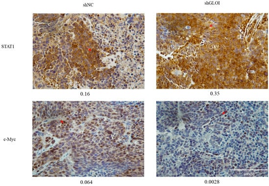 Inoculation with GLOI-depleted SW620 cells induced a significantly lower tumor burden in BALB/c nude mice than inoculation with shNC-transfected cells (Figure 9). The weights of tumors produced by shGLOI-transfected cells dissected on day 19 after inoculation were on average 60% lower than the weights of the tumors from the shNC group (p < 0.01) (Figure 9). Expression of STAT1 in GLOI-depleted tumors was 2-fold higher (p < 0.05) than in tumors from the shNC group (Figure 10A,B). Similarly, levels of p53 and Bax expression were 2.3-fold and 2.3-fold higher, respectively, in tumors generated by GLOI-depleted cells than in tumors generated by shNC-transfected cells, while c-Myc and Bcl-2 expression levels were 40% and 60% lower, respectively (p < 0.01 to 0.001) (Figure 10A,C–F). Immunohistochemical staining also showed higher IOD of expression of STAT1 and lower IOD of expression of c-Myc in tumors produced from GLOI-depleted cells than in tumors produced from shNC-transfected cells (Figure 11).