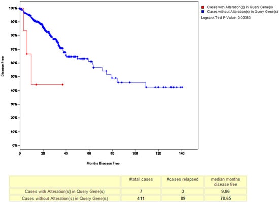 To analyze the relationship between GLOI and disease-free survival in CRC, we used a tool in www.cbioportal.org []. This analysis showed that the patients with a low-GLOI-expressing tumor had longer disease-free survival than the patients whose tumor expressed a high level of GLOI (p = 0.00366) (Figure 12). This finding was supported by another report demonstrating that the 5-year survival rate of groups whose tumor expressed a lower level of GLOI was significantly greater than that of the groups whose tumor expressed a higher level of GLOI in gastric cancer []. Evidence suggests that GLOI overexpression predicted shortened survival in the entire cohort and in early-stage cases in CRC. Thus, GLOI emerged as an independent prognosticator of adverse significance in the CRC patient cohort [].