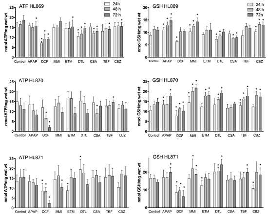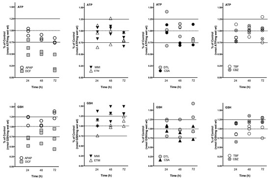 MMI (500 μM) exposure increased GSH levels significantly at 24 h (15%–37%) in two of three livers. GSH levels remained elevated and were significantly increased in the three livers at 48 h (11%–49%) and at 72 h (30%–49%). ETM (100 μM) increased GSH levels significantly in one liver at 48 h (32%) and 72 h (24%). Another liver decreased ATP levels significantly initially (24%) at 24 h, then exhibited elevated levels at 72 h (13%).