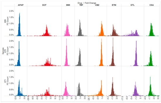 Heat shock and ER stress genes were affected across the livers by each drug. In particular, DCF altered 11 of 14 genes (24.5%) in all three livers. The other drugs affected genes in two or one liver, CSA (24 genes, 25.5%) exposure, followed by APAP (15 genes, 16.3%), ETM (12 genes, 18.1%), TBF (9 genes, 13.5%), CBZ (9 genes, 13.5%), DTL (11 genes, 12.3%) and MMI (8 genes, 15%).