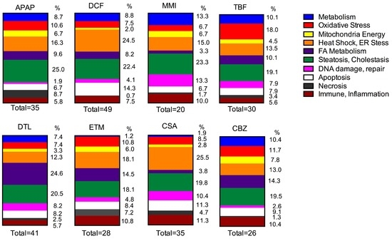 Genes indicative of necrosis were most evident following exposure to APAP (8 genes, 8.7%) and ETM (5 genes, 7.2%), followed by CSA (5 genes, 4.7%), TBF (3 genes, 3.4%), DTL (3 genes, 2.5%), CBZ (1 gene, 1.3%), MMI (1 gene, 1.7%), and DCF (1 gene, 0.7%).