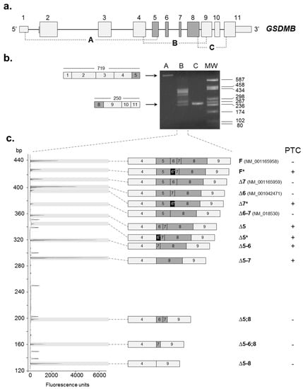 GSDMB alternative splicing (AS) pattern. (a) Schematic representation of the GSDMB gene. Exons are represented by boxes and are approximately drawn to scale; untranslated regions (UTRs) are depicted by smaller boxes; introns are represented by lines. Constitutive exons are colored in light grey and alternative exons in dark grey. The three reverse-transcription (RT)-PCR assays (A, B, and C) performed to cover the GSDMB coding region are indicated; (b) An illustrative agarose gel (2%) shows the amplification products of the three RT-PCR assays. For “A” and “C” assays, the unique amplification product and their length, expressed as base pairs (bp), are schematized on the left. For the “B” assay, multiple specific amplification products were obtained, corresponding to several AS events involving exons 4 to 9, which were further analyzed by both fluorescent RT-PCR and direct sequencing (see further). MW: molecular-weight marker (pUC9-HaeIII); (c) The left panel represents a demonstrative GeneMapper window showing the fluorescent RT-PCR products of the “B” assay (on RNA extracted from a healthy individual, heterozygous for the rs11078928 polymorphism), using the forward primer labelled with the HEX fluorophore. The filled peaks, shaded in grey, correspond to the RT-PCR products; empty peaks represent the size standard (ROX-500 HD). The vertical axis indicates the length of amplified products in bp, whereas the horizontal axis shows fluorescence units. The schematic representation and the name of the corresponding isoform product are indicated on the right side. The alternative exon 6* is depicted in black. F”: full length, “*” indicates the presence of exon 6* in the isoform, “∆” is followed by the skipped exon, separated by “-” or “,” if the exons are contiguous or not, respectively. The accession number of University of California, Santa Cruz (UCSC) Genome Browser-annotated isoforms is also indicated. The presence/absence in the transcript of a premature termination codon (PTC) is indicated by a “+”/“−”, respectively.
