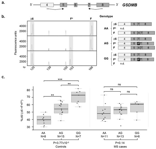 Analysis of exon 6/6* AS in multiple sclerosis (MS) cases and healthy controls. (a) Schematic representation of the GSDMB genomic region comprised between exons 4 and 8. Exons are approximately drawn to scale; alternative exons are depicted in dark grey, as in Figure 1. The dashed arrows below the scheme indicate the primer couple used in the fluorescent-competitive RT-PCR assay; the forward primer is labelled with the HEX fluorophore; (b) The left panel shows three GeneMapper windows, representing an example of the fluorescent products obtained for each of the rs11078928 genotypes. The peaks shaded in grey correspond to the RT-PCR products; those not shaded represent the size standard (ROX-500 HD). The schematic representation of the obtained products for each genotype is shown on the right. Exon 6* is depicted in black; (c) Boxplots showing the percentage of the Δ6 isoform with respect to the sum of Δ6, F*, and F isoforms measured on RNA extracted from 30 relapsing remitting (RR)-MS cases and 30 controls, grouped on the basis of the rs11078928 genotype. Boxes define the interquartile range; the thick line refers to the median. The number of subjects belonging to each group is also indicated (N). Significance levels of t-tests is shown above the boxplots (** p < 0.01; *** p < 0.001; ns: not significant). The one-way ANOVA p-values are reported below the boxplots.