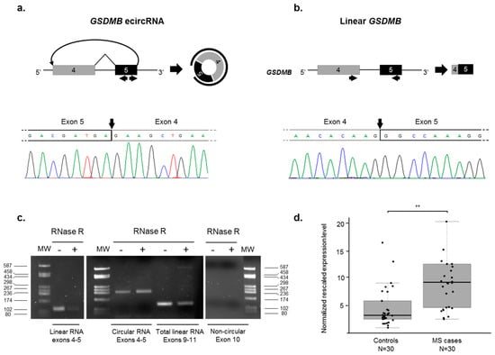 Characterization of the GSDMB exonic circular RNA (ecircRNA). (a) Schematic representation of the formation of the GSDMB ecircRNA through a backsplicing event between exons 4 and 5. Exons are approximately drawn to scale; exon 4 is depicted in grey, exon 5 in black. The curved arrow joins the 5′ splice site of exon 5 to 3′ splice site of exon 4. Arrows below exon 5 indicate the divergent primer couple used to detect the putative circular RNA (circRNA). On the right, a schematic representation of the circRNA is depicted, with the circular black line representing the product amplified by the primer couple. Below the scheme, direct-sequencing electropherograms show the head-to-tail splice junction, indicated by an arrow, located between GSDMB exons 5 and 4; (b) Schematic representation of the linear splicing involving exons 4–5. Arrows below exons 4–5 indicate the primer couple used in RT-PCR assays. Electropherograms showing the junction between exons 4 and 5 is also reported; (c) Agarose gel (2%) with the results of the RNase R treatment. The expression of the GSDMB ecircRNA was evaluated by RT-PCR in untreated (−) or RNase R-treated (+) RNA of a healthy control, using the divergent primer couple within exon 5. Expression of total GSDMB linear mRNA was also evaluated, using the RT-PCR assay shown in Figure 2 (linear product; exons 9–11), the assay reported in (b) (linear product; exons 4 and 5), as well as an assay using a divergent primer couple on exon 10 (negative control; no circRNA detected). MW: molecular-weight marker (pUC9-HaeIII); (d) Boxplots show expression levels of the GSDMB ecircRNA measured by semi-quantitative real-time RT-PCR in PBMCs of 30 MS cases and 30 healthy controls. Boxes define the interquartile range; the thick line refers to the median. Results were normalized to expression levels of the HMBS housekeeping gene. The number of subjects belonging to each group is also indicated (N). The significance level of t-test analysis is shown. ** p < 0.01.