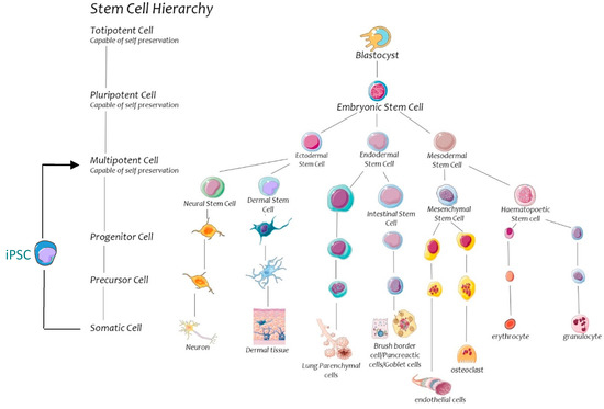 Totipotent cells of the blastocyst are capable of differentiation into embryonic and placental tissue. Stem cells can be grouped into three primary dermal layers (endodermal, ectodermal and mesodermal) and eventually mature into various somatic cells. Induced pluripotent stem cells (iPSC) are formed when somatic cells are manipulated to regress their maturity.