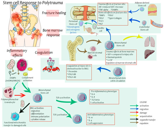 Trauma causes structural damage to tissue, impairs tissue perfusion and triggers inflammation. The physiological response of stem cells to trauma include awakening from their resting state, mobilising from their niches, migrating towards sites of injury and differentiating to generate specific cells required for healing. Alternatively, pathological inflammatory response to injury can impair stem cell function and deplete stem cell population due to terminal differentiation, which leads to suboptimal tissue regeneration and poor outcomes [22,23,24].