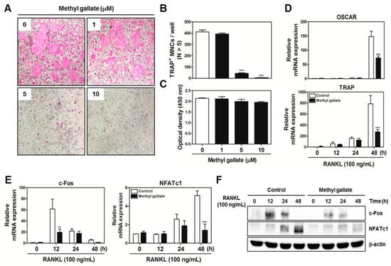 To examine the effect of methyl gallate on RANKL-induced osteoclast differentiation, various concentrations (0, 1, 5, and 10 µM) of methyl gallate were incubated with BMMs in the presence of M-CSF (30 ng/mL) and RANKL (100 ng/mL). The results showed that methyl gallate reduced formation of osteoclast-like cells in a dose-dependent manner (Figure 1A).