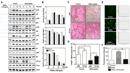 Methyl gallate suppresses phosphorylation of Akt, Btk, and PLCγ2. (A) BMMs were preincubated with or without methyl gallate (10 µM) for 1 h in the presence of M-CSF (30 ng/mL) before RANKL (100 ng/mL) stimulation at the indicated time points. Whole-cell lysates were analyzed by Western blotting with the indicated antibodies. β-Actin was used as internal control; (B) Quantification of relative ratio of band intensity was performed using Image J software. *** p < 0.001; (C) BMMs were infected with retroviruses expressing pMX-IRES-EGFP (pMX) and pMX-CA-Akt-EGFP. The infected BMMs were cultured with or without methyl gallate (10 µM) in the presence of M-CSF (30 ng/mL) and RANKL (100 ng/mL) for 4 days. After that, the cells were fixed and stained with a TRAP solution. TRAP-positive cells were photographed under a light microscope at the indicated magnification (10×); (D) The number of TRAP-positive MNCs (nuclei > 5) was counted in these cultures. * p < 0.05; ** p < 0.01; (E) BMMs were incubated with M-CSF (30 ng/mL) and RANKL (100 ng/mL) in the presence or absence of methyl gallate (10 µM) for 3 days. For Ca2+ quantification, the cells were incubated with Fluo-3/AM for 30 min in serum-free-MEM followed by confocal imaging analysis at the indicated magnification (40×). Each line shows the fluorescence intensity of the respective condition. The fluorescence intensity in each group was recorded within 80 s; (F) The intensity of Fluo-3/AM was statistically analyzed at time point 80 s. *** p < 0.001; ### p < 0.001.