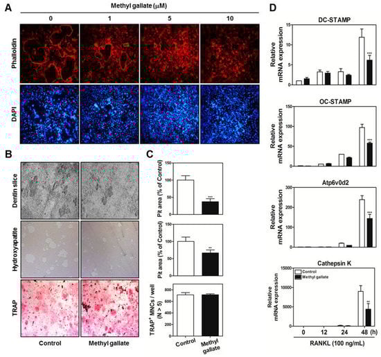 The results suggested that considerable formation of resorption pit areas was taking place in the control group of dentin slices and hydroxyapatite-coated plates; however, methyl gallate significantly disrupted the ability of mature osteoclasts to form resorption pits in these cultures. Through TRAP staining analysis, we confirmed that the antiresorptive action of methyl gallate did not exert any cytotoxicity on mature osteoclasts (Figure 3B,C). In line with these phenomena, the quantitative RT-PCR data proved that methyl gallate decreased the mRNA expression of several transcription factors associated with cell–cell fusion and osteoclastic bone resorption: DC-, OC-STAMP, Atp6v0d2, and Cathepsin K (Figure 3D). This finding clearly showed that methyl gallate attenuated expression of DC-, OC-STAMP, Atp6v0d2, and Cathepsin K, negatively influencing not only the formation of F-actin ring-positive osteoclasts but also their ability to dissolve bone.