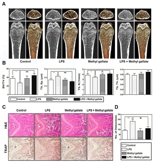 To determine whether the in vitro effect of methyl gallate on osteoclastic differentiation and function can be true in vivo, we used mice with LPS-induced bone loss as a model of osteoporosis based on induced inflammation. The mice were injected with LPS intraperitoneally and were orally treated with methyl gallate or phosphate buffered saline (PBS). After 8 days, the left femurs of euthanized mice were analyzed using a micro-computed tomography (CT) system and the right femurs were stained with TRAP and hematoxylin and eosin (H&E). Although the treatment with LPS reduced bone mass in femurs of mice compared with the control group, 2D and 3D visualization indicated that there was a partial recovery of bone volume in the LPS-and-methyl gallate-treated group of mice (Figure 4A).