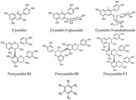 - Johansen, O.-P.; Andersen, Ø.M.; Nerdal, W.; Aksnes, D.W. Cyanidin 3-[6-(p-coumaroyl)-2-(xylosyl)-glucoside]-5-glucoside and other anthocyanins from fruits of Sambucus canadensis. Phytochemistry 1991, 30, 4137–4141. [Google Scholar] [CrossRef]