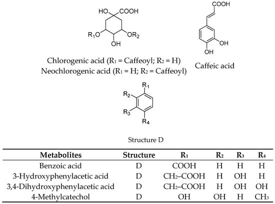 Freeze-dried elderberries and elderflowers were extracted with dichloromethane (DCM), 96% EtOH, 50% EtOH, and water (50 and 100 °C) on an accelerated solvent extraction instrument (ASE). The phenol–sulfuric acid test [] and 1H NMR analyses revealed that carbohydrates were present in the 50% EtOH and 50 and 100 °C water extracts. 1H and 13C NMR analyses of the EtOH elderberry and elderflower extracts showed signals from aromatic compounds, organic acids, and carbohydrates. The 96% EtOH elderflower extract showed signals which could be attributed to rutin [] and caffeoyl moieties [], structures previously reported to be major constituents in the elderflowers []. From the acidic elderberry MeOH extract (800 g), cyanidin-3-glucoside (340 mg, 0.043% yield) and cyanidin-3-sambubioside (250 mg, 0.031% yield), the major anthocyanins in elderberry, were isolated, in addition to the aglycone cyanidin (270 mg, 0.034% yield). The substances were identified by one- and two-dimensional NMR spectroscopy (1H, 13C, COSY, APT, HSQC, and HMBC) and the spectroscopic data were compared with those reported in the literature [,]. Chemical structures of the phenolic constituents and their metabolites from elderberries and elderflowers employed in this study are shown in Figure 1 and Figure 2.
