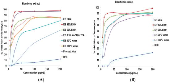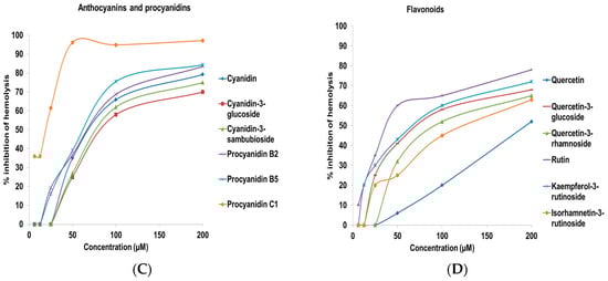 Complement fixating activity, expressed as % inhibition of hemolysis of sensitized sheep erythrocytes. Inhibition of hemolysis by (A) crude extracts from elderberry; (B) crude extracts from elderflower; (C) isolated anthocyanins and procyanidins; and (D) flavonoids. The results represent the mean of three independent experiments.