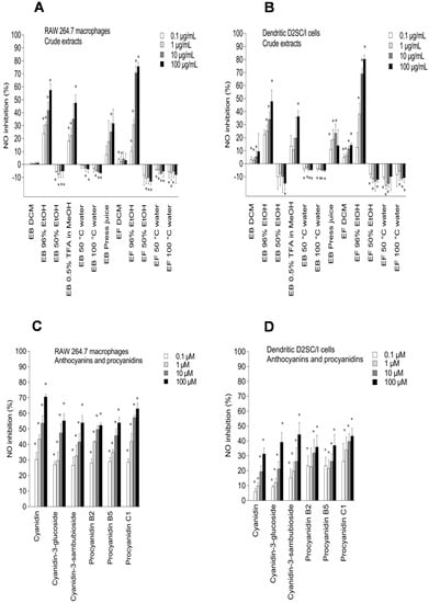 During inflammation, bacterial products and proinflammatory cytokines induce the formation of large amounts of nitric oxide (NO) by inducible nitric oxide synthase (iNOS), and compounds that inhibit NO production can be inflammatory modulators. Exposure of lipopolysaccharides (LPS) to macrophages triggers several disadvantageous cellular responses and causes responses similar to inflammation, sepsis, and stroke. Macrophages and dendritic cells play a major role in the initiation and modulation of immune responses []. An induction of iNOS in dendritic cells or macrophages via stimulation with LPS has been described in the literature []. The dendritic cells may function as the most potent antigen-presenting cells for T cell activation, and increased levels of NO may inhibit T cell proliferation and apoptosis in the dendritic cells []. The proposed mechanism associated with the inhibition of NO production in macrophages is scavenging of NO radicals, direct inhibition of iNOS enzyme activity, and/or inhibition of iNOS gene expression []. The inhibitory effect of elderberry and elderflower extracts, constituents, and metabolites on NO production in RAW 264.7 cells and dendritic D2SC/I cells exposed to LPS are shown in Figure 4. The NO concentration after exposure to the LPS control was 10.3 ± 2.1 µM for the RAW 264.7 cells and 14.6 ± 2.4 µM for the dendritic D2SC/I cells. Quercetin, which is a constituent in elderflower, was used as a positive control as well [].