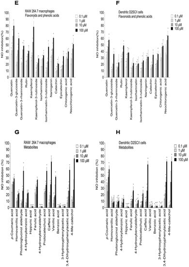 Inhibitory effects of elderberry (EB) and elderflower (EF) crude extracts (A,B); anthocyanins and proanthocyanidins (C,D); flavonoids and phenolic acids (E,F); and metabolites (G,H) on NO production in lipopolysaccharide (LPS)-activated RAW 264.7 macrophages (A,C,E,G) and dendritic D2SC/I cells (B,D,F,H). The experiments were repeated independently three times, and results shown are expressed as the average ± SEM. * p < 0.05 as compared to response of lipopolysaccharide (LPS) (0.1% DMSO) alone.