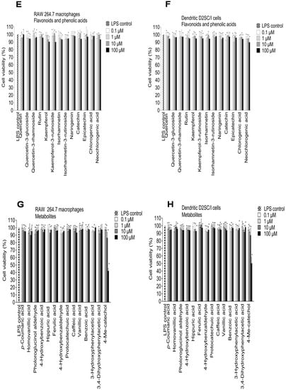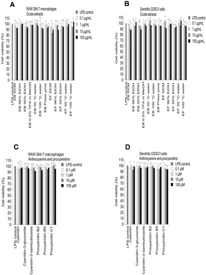 Effect of elderberry (EB) and elderflower (EF) crude extracts (A,B); anthocyanins and proanthocyanidins (C,D); flavonoids and phenolic acids (E,F) on cell viability in LPS-activated RAW 264.7 cells (A,C,E,G) and dendritic D2SC/I cells (B,D,F,H). Cell viability was assessed using the MTT assay. The experiments were repeated independently three times, and results shown are expressed as the average ± SEM. * p < 0.05 vs. LPS (0.1% DMSO) as control.
