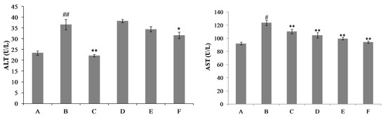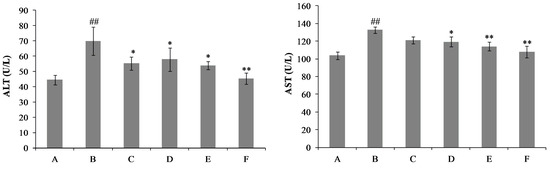 Effects of nicotiflorin on hepatic homogenate ALT and AST in d-GalN-intoxicated mice. (A) Control group; (B) d-GalN-treated group; (C) d-GalN and DDB (150 mg/kg bw)-treated group; (D) d-GalN and nicotiflorin (25 mg/kg bw)-treated group; (E) d-GalN and nicotiflorin (50 mg/kg bw)-treated group; and (F) d-GalN and nicotiflorin (100 mg/kg bw)-treated group. Values are mean ± S.E.M., n = 10. # p < 0.05, ## p < 0.01 compared with the control group. * p < 0.01, ** p < 0.01 compared with the d-GalN group.