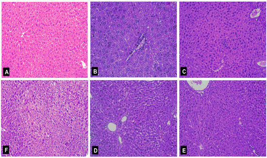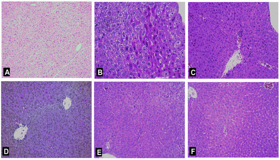 Histological analysis of the livers after d-GalN administration. Typical images were chosen from the different experimental groups (original magnification 10 × 20). (A) Control group; (B) d-GalN-treated group; (C) d-GalN and DDB (150 mg/kg bw)-treated group; (D) d-GalN and nicotiflorin (25 mg/kg bw)-treated group; (E) d-GalN and nicotiflorin (50 mg/kg bw)-treated group; and (F) d-GalN and nicotiflorin (100 mg/kg bw)-treated group.