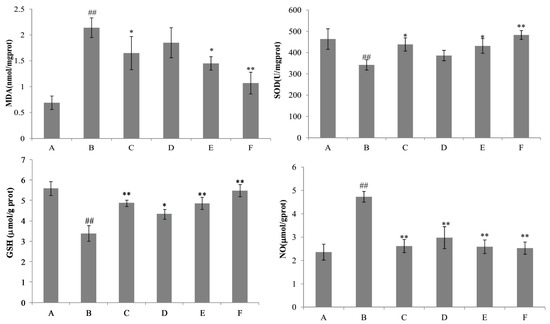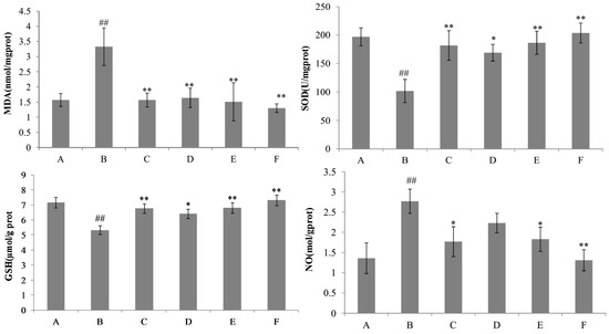 Effects of nicotiflorin on hepatic homogenate SOD, MDA, GSH, and NO in d-GalN-intoxicated mice. (A) Control group; (B) d-GalN-treated group; (C) d-GalN and DDB (150 mg/kg bw)-treated group; (D) d-GalN and nicotiflorin (25 mg/kg bw)-treated group; (E) d-GalN and nicotiflorin (50 mg/kg bw)-treated group; and (F) d-GalN and nicotiflorin (100 mg/kg bw)-treated group. Values are mean ± S.E.M., n = 10. ## p < 0.01 compared with the control group. * p < 0.05, ** p < 0.01 compared with the d-GalN group.