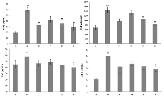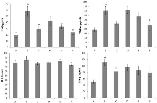 Effects of nicotiflorin on the serum IL-1β, TNF-α, IL-6, and IFN-γ in d-GalN-intoxicated mice. (A) Control group; (B) d-GalN-treated group; (C) d-GalN and DDB (150 mg/kg)-treated group; (D) d-GalN and nicotiflorin (25 mg/kg bw)-treated group; (E) d-GalN and nicotiflorin (50 mg/kg bw)-treated group; and (F) d-GalN and nicotiflorin (100 mg/kg bw)-treated group. Values are mean ± S.E.M., n = 10. # p < 0.05, ## p < 0.01 compared with the control group. * p < 0.05, ** p < 0.01 compared with the d-GalN group.