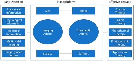 A nanostructure can also incorporate multiple therapeutic agents and deliver the multiple components to the tumor site. Each therapeutic agent or drug may have its own strengths, and combination therapies may have synergistic effects in cancer treatment. This strategy can minimize the side effects of the therapeutic agents because engineering of nanostructure in terms of size, shape, surface properties and stiffness can significantly increase tumor accumulations [,,,,]. Moreover, the ability to load multiple payloads, including imaging and therapeutic agents, into the nanostructure provides both the visualization of nanoparticles at the tumor site and real-time monitoring of the tumor conditions; the resulting information enables the optimization of injection dosage and frequency for cancer therapy and minimizes the side effects (Figure 1).