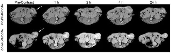 MR contrast agents using chitosan nanoparticles have been reported for cancer MR imaging [,,,,,,,]. Nwe et al. reported T1 contrast agents using 1,4,7,10-tetraazacyclododecane-1,4,7,10-tetraacetic acid 1-(2,5-dioxo-1-pyrrolidinyl) ester (DOTA-NHS) and water-soluble glycol chitosan (GC) polymer, followed by Gd chelation []. Two hours after injection of chitosan nanoparticles into tumor-bearing mice, positive contrast effects were clearly observed in the tumor microenvironment (Figure 2). For T2 contrast effects, superparamagnetic iron oxide (SPIO) nanoparticles are mostly used due to their properties of low magnetic aggregation. SPIO nanoparticles have been encapsulated in the cores of hydrophobically-modified chitosan [,,,].