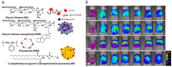 (A) Chemical structures of glycol chitosan (GC), glycol chitosan–5β-cholanic acid nanoparticle (CNP), polystyrene nanoparticle (PNP) and 1,2-dipalmitoyl-sn-glycero-3-phosphocholine liposome (LNP); (B) in vivo NIRF images of liver tumor-bearing mouse model at 0, 1, 3, 6, 9, 12 and 24 h after systemic injection of Cy5.5-labeled nanoparticles (Adapted with permission from []. Copyright 2016 American Chemical Society).