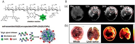 (A) Chemical structures of Cy5.5-labeled and DOTA-conjugated glycol chitosan-5β-cholanic acid nanoparticles; (B) T1-weighted MR and optical images of liver tumor-bearing mice after injection of Cy5.5-labeled Gd(III)-chitosan nanoparticles: (a) axial view of liver tumor-bearing mice pre-injection and 12, 24 and 48 h post-injection (red dots mark the tumor area, demonstrating positive contrast effects); (b) bright field and NIRF liver cancer images indicated by black arrows (Adapted with permission from []. Copyright 2016 Royal Society of Chemistry).
