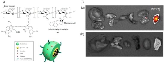 (A) Chemical structures and schematic diagram of glycol chitosan conjugated to hydrophobic 5β-cholanic acid and bladder cancer-targeting peptide (CSNRDARRC) and physically loaded with iron oxide nanocubes (NCs); (B) the combination demonstrated a specific tumor-targeting capability with minimized accumulation in other organs: (a) after NP administration and (b) before NP administration (Adapted with permission from []. Copyright 2016 DOVE Medical Press).