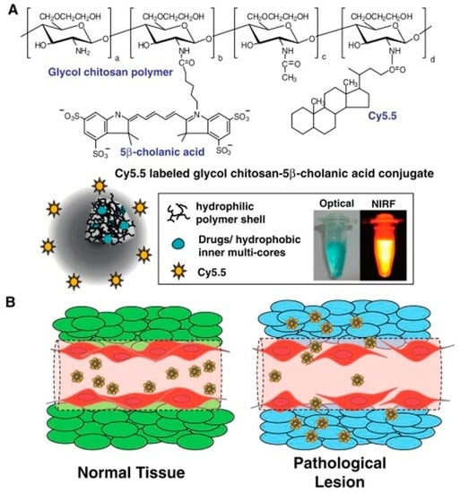 (A) Chemical structure and schematic diagram of hydrophobically-modified glycol chitosan nanoparticles for use in cancer diagnosis and therapy; (B) schematic diagram illustrating the accumulation of nanoparticles in pathological lesions (Adapted with permission from []. Copyright 2014 Elsevier B.V.).