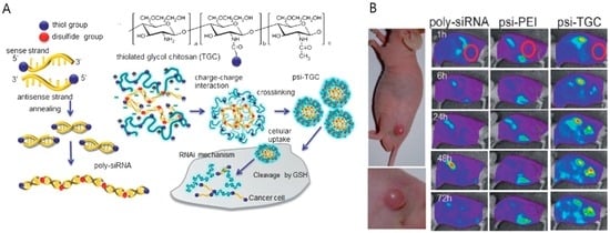 (A) Schematic diagram of poly-siRNA and poly-siRNA/glycol chitosan nanoparticle (psi-TGC); (B) whole-body images of tumor-bearing mice after injection with poly-siRNA, psi-polyethyleneimine and psi-TGC, respectively. psi-TGC showed longer circulation in the body and more accumulation at the tumor site, indicated by red circles (Adapted with permission from []. Copyright 2012 WILEY-VCH Veriag GmbH & Co. KGaA, Weinheim).